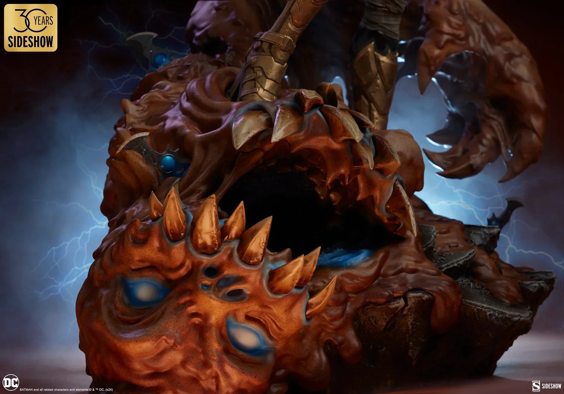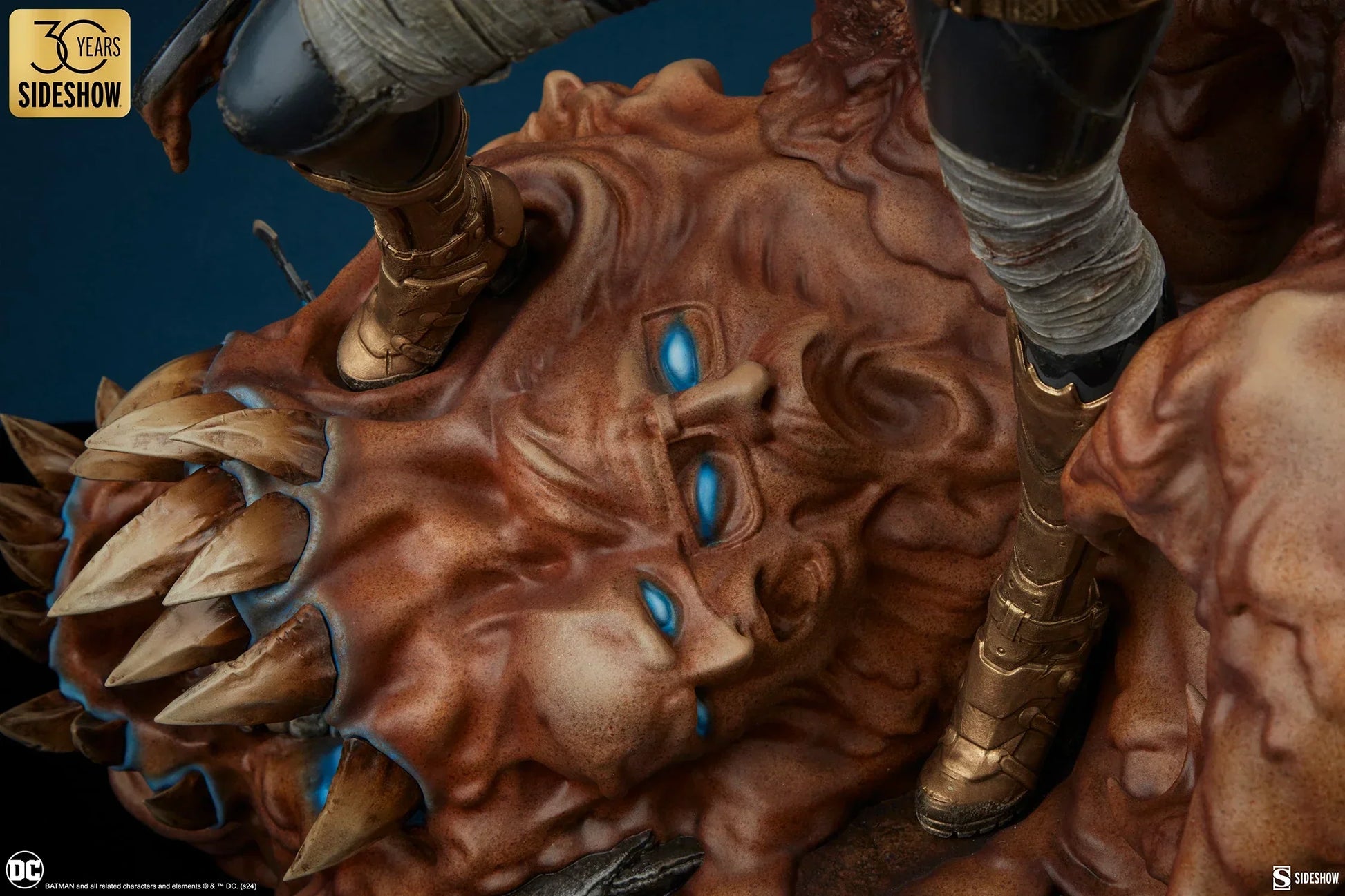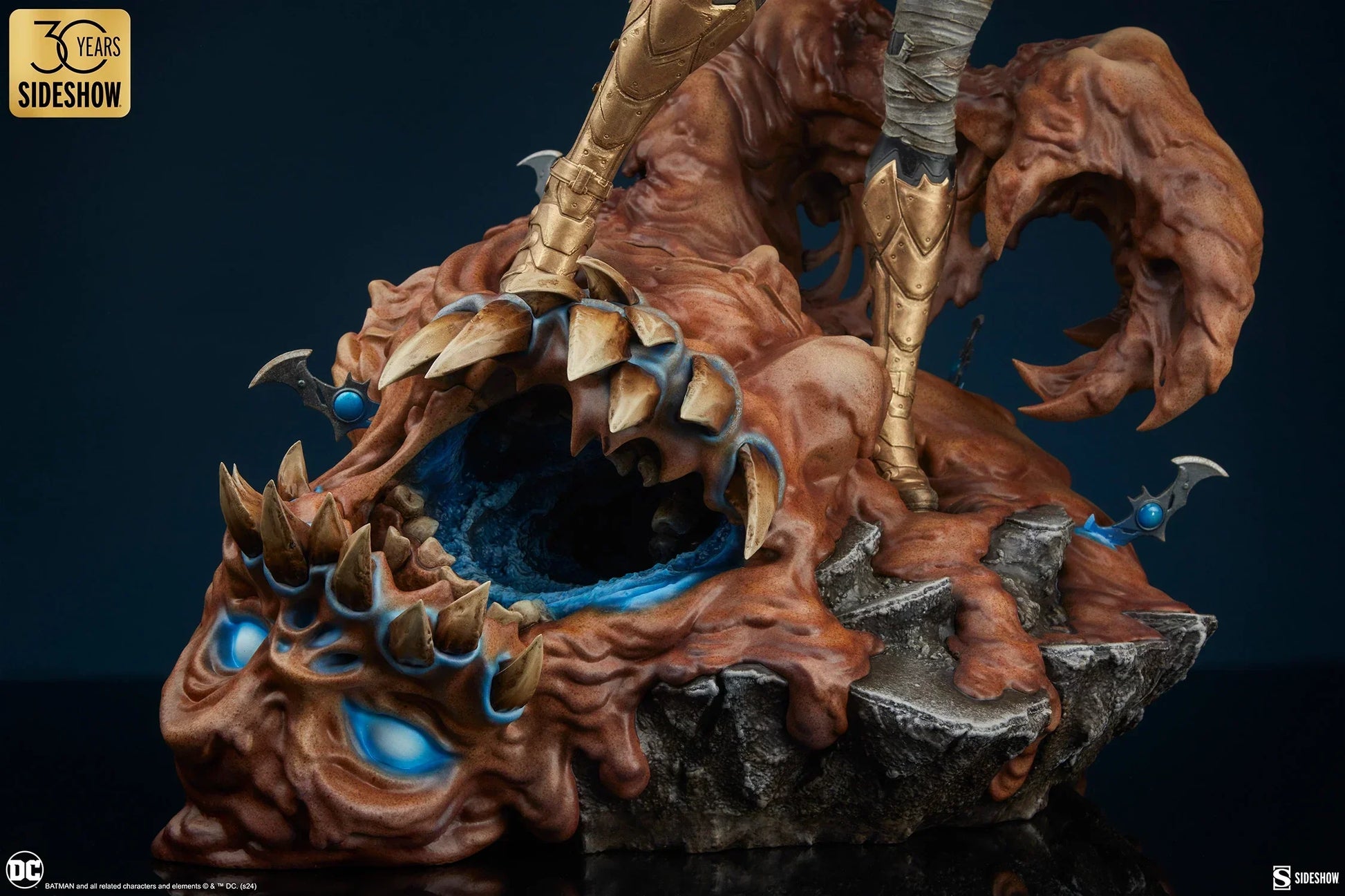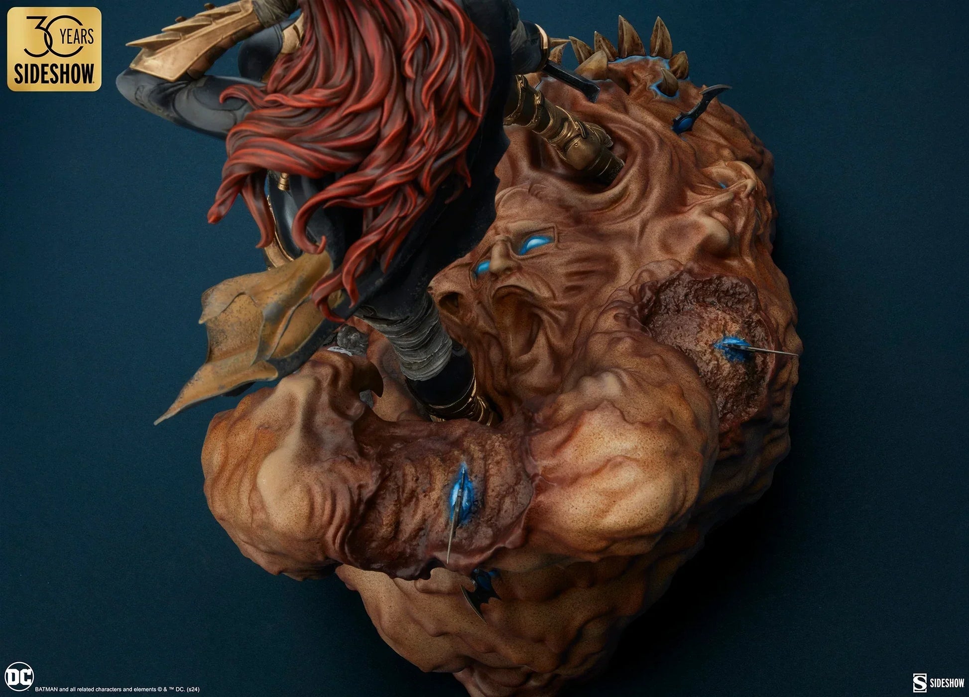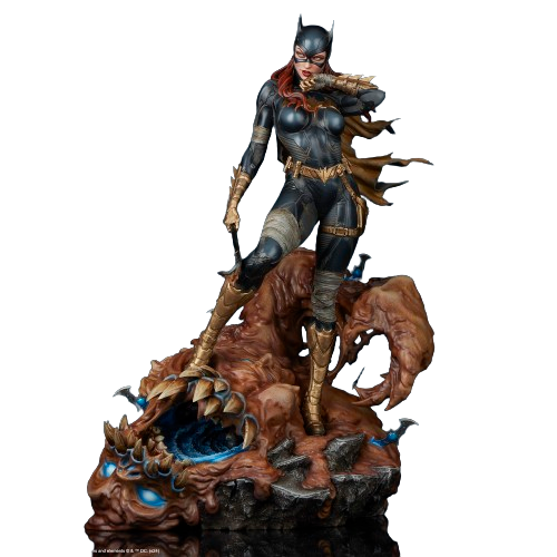 The polystone Batgirl Premium Format Figure measures 21.73” tall by 13.43” wide by 13.9” deep. Inspired by the characters as they appear in DC Comics, this collectible is fully sculpted to capture everything from her costume details down to the varied textures of Clayface’s body. Cloth-like bandages wrap Batgirl’s arms and legs, while her tactical Batsuit is accented with armored gold elements like gauntlets, boots, and a utility belt. Batgirl’s outfit is weathered to reflect the perils of crimefighting in Gotham City, and a tattered cape flutters off her shoulder. Below her, Clayface alternates between melting, muddy ooze and dried, cracked dirt where the Batarangs have zapped him.