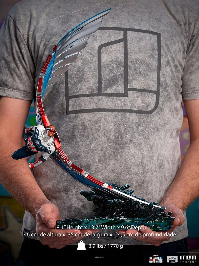 On a base that resembles the Hudson River, cutting through the waters with one of its mighty mechanical wings, the new winged Sentinel of Liberty uses all of its enhanced maneuverability and agility skills, as an actual bird of prey, with its new outfit with stars and stripes in the colors of his country`s flag, carrying on his back the legendary shield of his predecessor. He flies at high speeds over New York City on a mission to rescue the victims of the terrorist and anti-nationalist group known as Flag Smashers. Inspired by the "One World, One People", the sixth and final episode of the first season of the miniseries "The Falcon and the Winter Soldier" on the Disney+ streaming channel, Iron Studios presents the statue "Captain America Sam Wilson Deluxe - The Falcon and the Winter Soldier - BDS Art Scale 1/10, with the hero, formerly called Falcon, taking on the name and legacy of the first avenger.