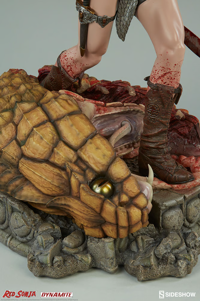 Since her fearless debut in 1973, Red Sonja has redefined the fantasy genre with her fiery temper and ferocious ability to best any man or beast in combat. The confident crimson-haired heroine requires little protection in her travels, her sleek muscular body clad in sparse scale mail, ornate cuffs and pauldrons, and thick leather boots and gloves. Her face a mask of fierce determination and smoldering pride, Red Sonja cleaves her way through the fresh glistening carcass of a monstrous serpent, her twin blades drenched in the blood spilled just moments before. Standing 20” tall in a magnificent dynamic composition, Sideshow’s Red Sonja She-Devil with a Sword Premium Format™ Figure captures the legendary warrior-woman at her best – forging her own path, leaving only death and destruction in her wake.