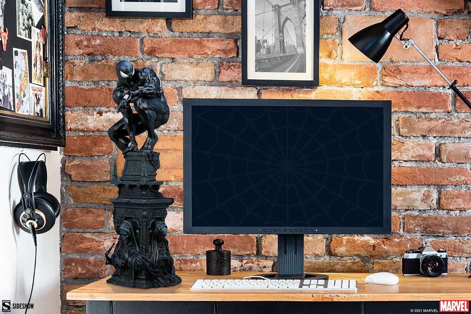Inspired by a classic comic book storyline, the polyresin Symbiote Spider-Man Premium Format™ Figure features a fully sculpted rendition of the infamous black costume over our hero's athletic physique. His suit features a white raised spider-symbol on his chest and back, white web shooters on the back of each hand, and large white eyes on his masked face. The dark symbiote is sculpted with varied textures that mimic the movement of this alien entity as it bonds to Spider-Man. Peter Parker takes on a darker persona wearing this unique symbiote suit, reflected in his posture and stern gaze at the city below.