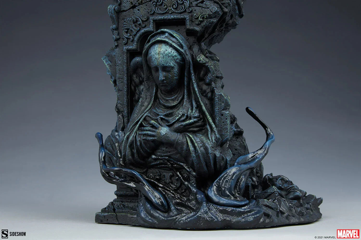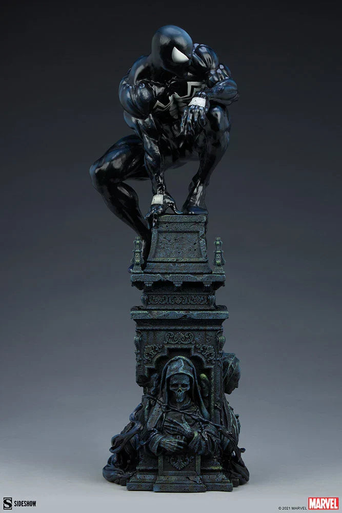 The Symbiote Spider-Man Premium Format™ Figure measures 24” tall as everyone’s favorite wall crawler crouches atop a crumbling church bell tower. Tendrils of the Klyntar symbiote substance wind their way up the detailed tower base, eager to reunite with their host. The tower beneath him features realistic stonelike textures as well as crumbling reliefs depicting a weeping woman and a skeletal figure.