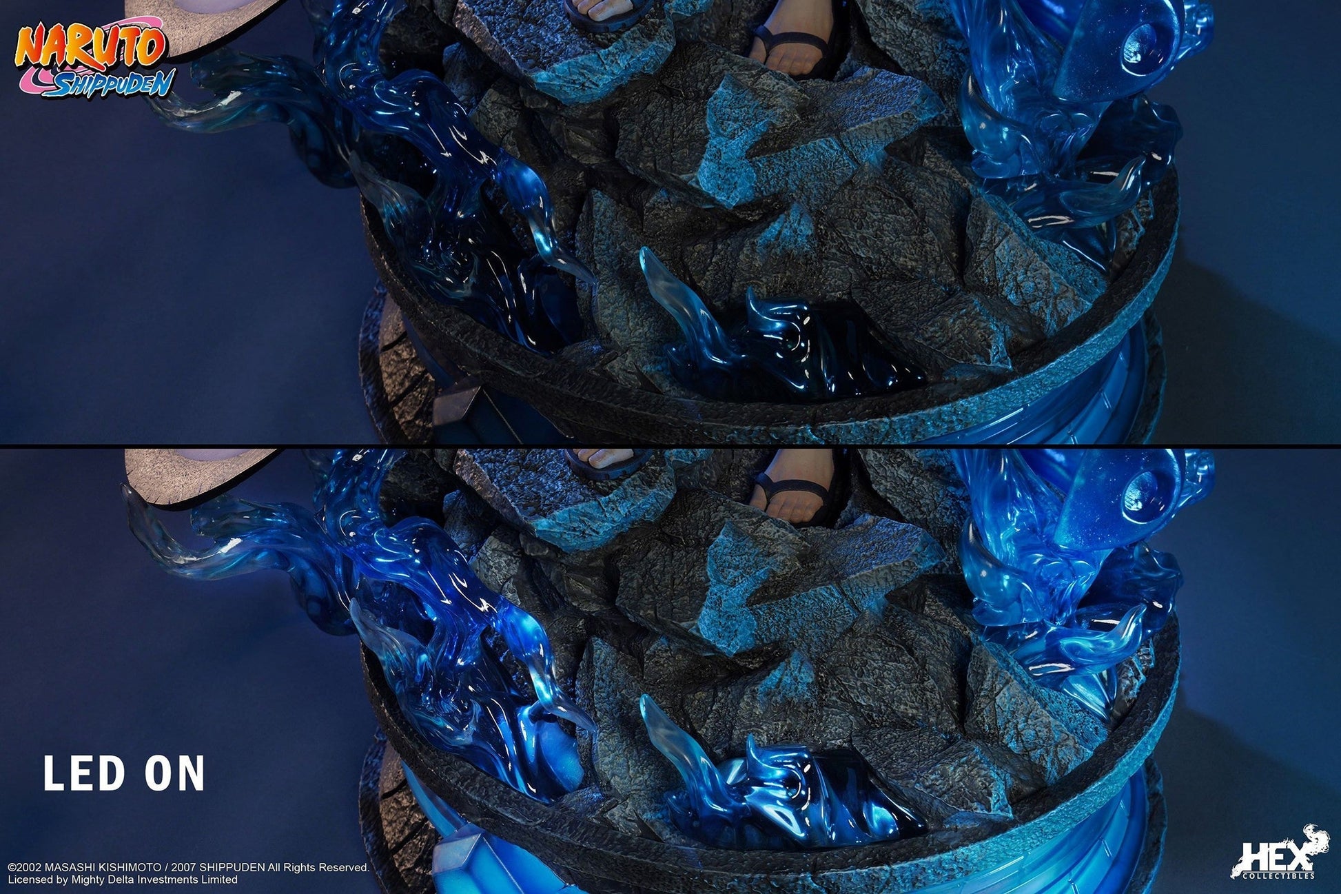 The round pedestal which has rocky-like textures is decorated with a star-shaped forehead and waist protectors of Susano’o. Transparent ribs formed by Susano’o cover Madara’s body, and chakra flames burst out from the rocky base, which adds a dynamic feeling to the statue.